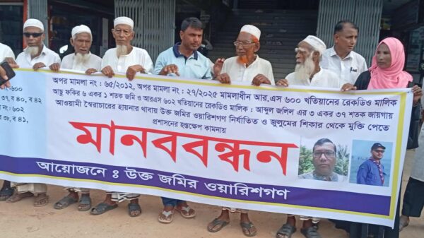 পেকুয়ায় আ’লীগ নেতার হাত থেকে জমি রক্ষা করতে মানববন্ধন
