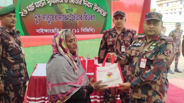 জাহাঙ্গীর আলম কাজল,নাইক্ষ্যংছড়ি: স্বাধীনতা দিবস উপলক্ষে গরিব ও অসহায়দের মাঝে ইফতার বিতরণ করেছে নাইক্ষ্যংছড়ি জোন ১১ বিজিবি। মঙ্গলবার (২৬ মার্চ) বিকেলে অসহায় কয়েকশো নারী-পুরুষের মাঝে সুস্বাদু ইফতার ও রাতের খাবারসহ