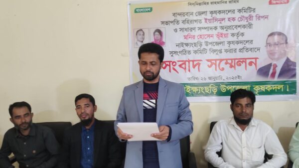 জাহাঙ্গীর আলম কাজল,নাইক্ষ্যংছড়ি: বান্দরবানের নাইক্ষ্যংছড়ি উপজেলা কৃষকদলের কমিটি বিলুপ্তির প্রতিবাদে সংবাদ সম্মেলনের আয়োজন করেছেন উপজেলা কৃষকদল। রবিবার (২৬ জানুয়ারি) সকাল ১১ টায় নাইক্ষ্যংছড়ি প্রেসক্লাবে সংবাদ সম্মেলনে লিখিত বক্তব্য পাঠ করেন